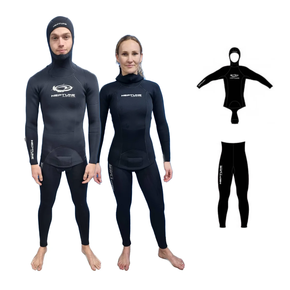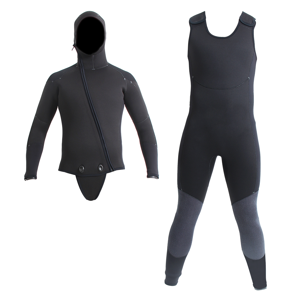 Een wetsuit kan ook uit meerdere delen bestaan. Hier een broek en een vest.