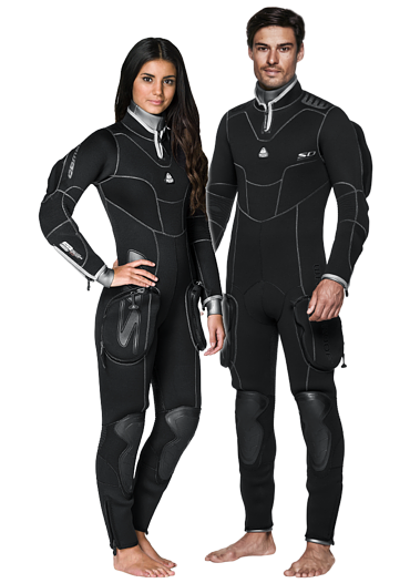 Deze pakken lijken op wetsuits, maar hebben betere afsluitingen bij de polsen, enkels en nek, waardoor er bijna geen water binnenkomt.